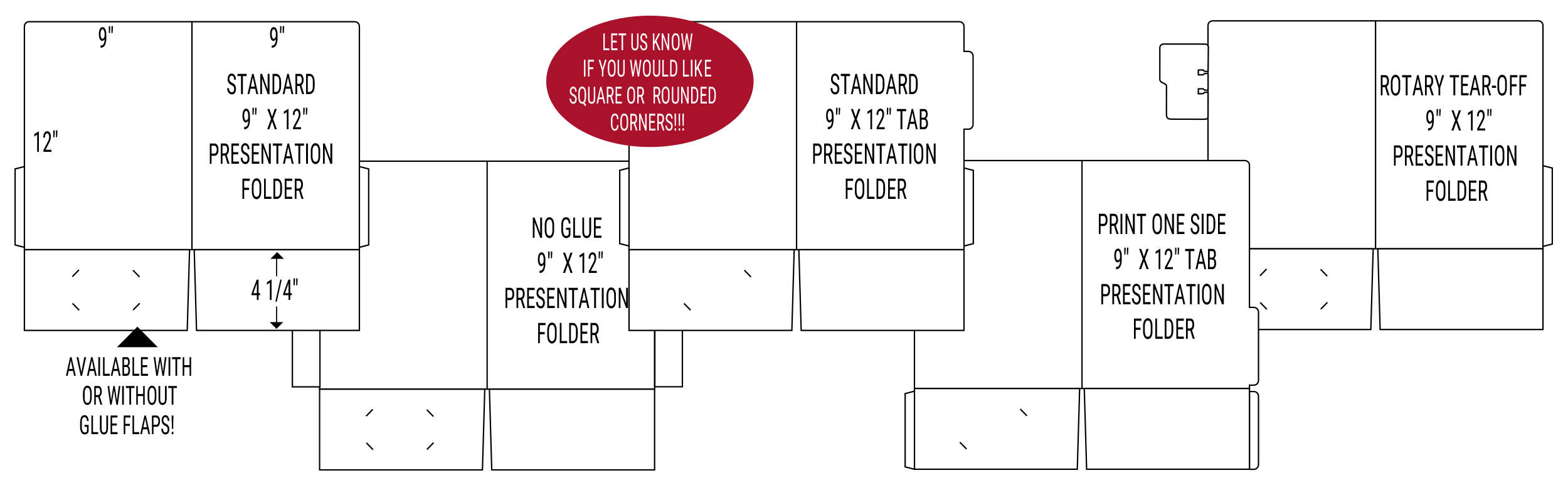 All of our presentation folders are available with or without glue flaps, square or rounded corners and optional business card slits! Please let us know when ordering. Presentation folders come standard with two pockets and business card slits on the inside right pocket. they are shipped actual freight and are non-returnable.